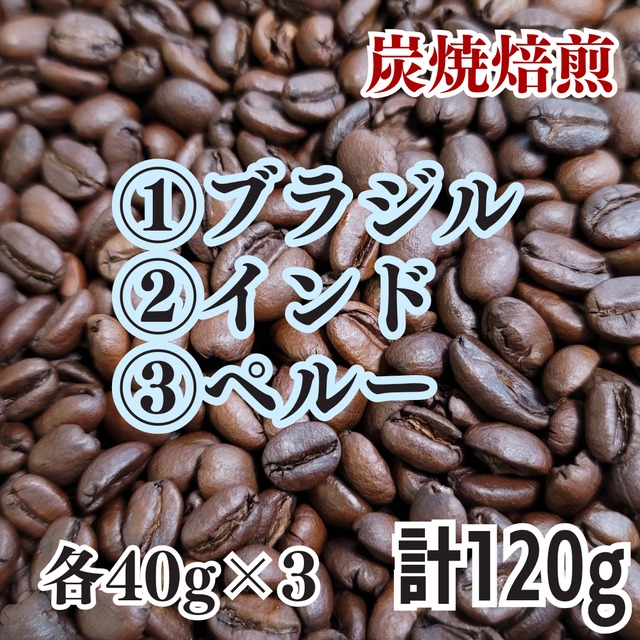 【ブラジル・インド・ペルー】3種類×40g 炭焼 自家焙煎コーヒー豆 計120g