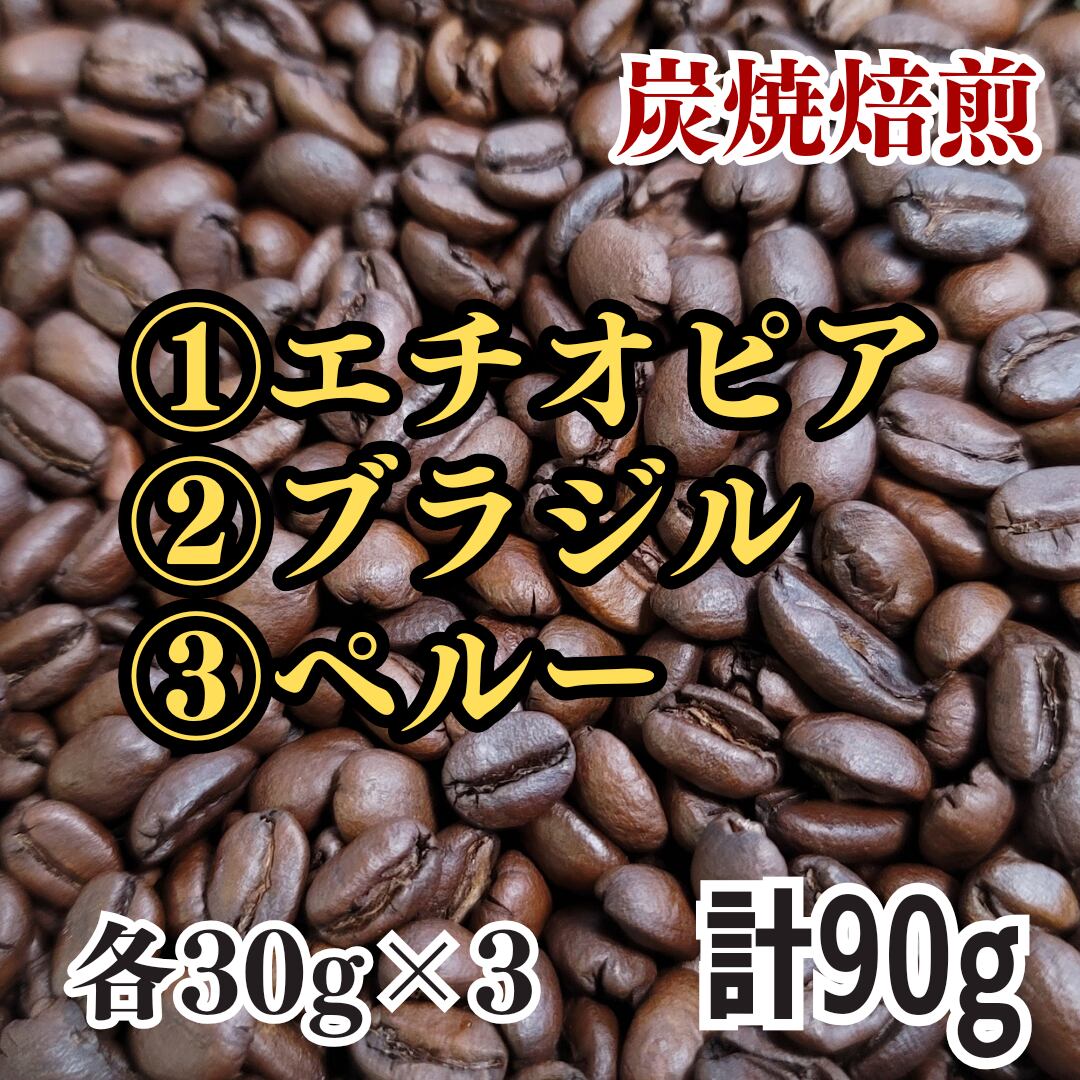 【エチオピア・ブラジル・ペルー】3種類×30g 炭焼自家焙煎珈琲豆 計90g